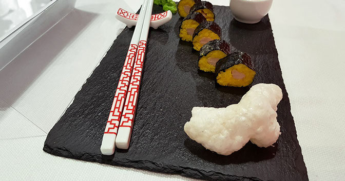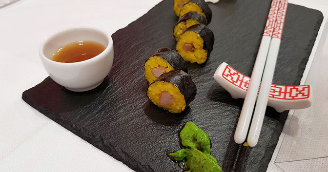 Rivisitazione del sushi con ripieno di riso allo zafferano e cuore di carne di vitello ed ossobuco